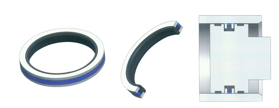 The SPGW type xipuli seal is a compactly designed bidirectional piston seal consisting of a polytetrafluoroethylene (PTFE) sealing ring, a nitrile elastomer ring, and two retaining rings.