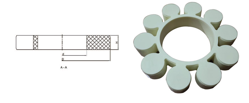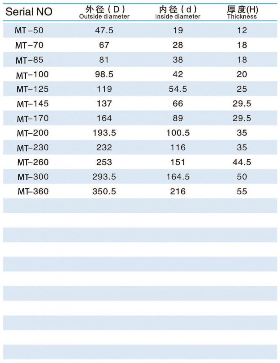 MT (DIN standard) type high-torque elastic buffer pad Purpose Suitable for high-torque applications, it can compensate for axial and radial angular deviations. Applicable temperature range: -30-100℃ Material: PU (polyurethane) Hardness: 72D